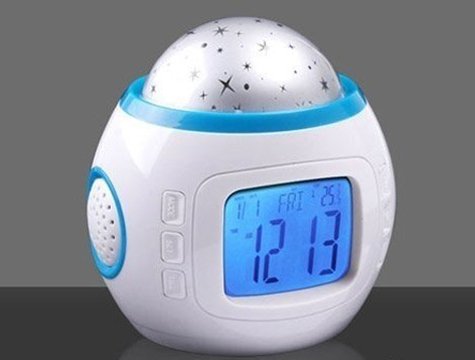<p>Projeksiyonlu Işık Saçan Müzikli Masa Saati Termometre - Saat - Ay - Yıl - Alarm</p><p>Evlerinizde kullanabileceği alarmlı, ışıklı, projeksiyonlu dekoratif bir Işık Saçan Müzikli Masa Saati.<br></p><p>Projeksiyonlu Masa Saati Tavanınıza yansıtacağı ay ve yıldız şöleni ile geceleri uykuya dalmanız çok rahat ve eğlenceli bir hal alacak.<br></p><p>Birbirinden farklı müzik sesleri, dalga sesleri, su sesleri çıkararak odanızı 3 farklı renkte yıldızlarla donatan bu saatle çok eğleneceksiniz.<br></p><p>Karanlıkta çok güzel bir ışık şöleni oluşturan bu saat çıkardığı müzik sesleriyle de dinlendirici bir etki sağlıyor.<br></p><p><br></p><p><b><u>Ürün Özellikleri:</u></b><br></p><ul><li>Tarih, saat, hafta, ay, yıl ve sıcaklık göstergesi<br></li><li>Termometre: Santigrat sıcaklık ve Fahrenheit sıcaklığı (0 ° C-50 ° C, 32 ° C-122 ° F arasında)</li><li>12 saat veya 24 saat formatında dakika ve saat görüntüleme</li><li>Chord müzik / doğa sesleri alarm</li><li>Erteleme fonksiyonu</li><li>Geri sayım fonksiyonu</li><li>Dört doğal ses şarkıları ve seçtiğiniz için altı akor şarkı</li><li>Zamanlı müzik çalma fonksiyonu</li><li>Renkli yıldızlı gökyüzü dinamik projeksiyon müzik ritimleri ile eşlik eder.</li><li>Arka ışık fonksiyonu</li><li>3 adet AAA İnce Kalem Pil ile çalışmaktadır. (Piller paket içeriğine dahil değildir.)</li></ul><p><br></p><p><b><u>Ürün Ölçüleri:</u></b></p><ul><li>En: 10 cm<br></li><li>Boy: 11 cm</li></ul><p><b><u>Paket İçeriği:<br></u></b></p><ul><li>1 Adet Projeksiyonlu Işık Saçan Müzikli Masa Saati<br></li></ul>